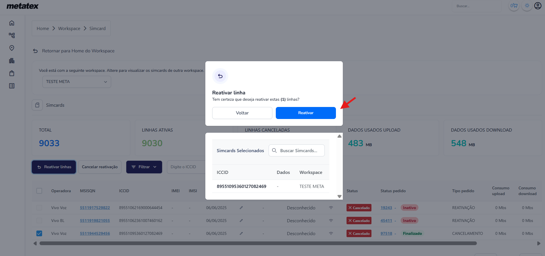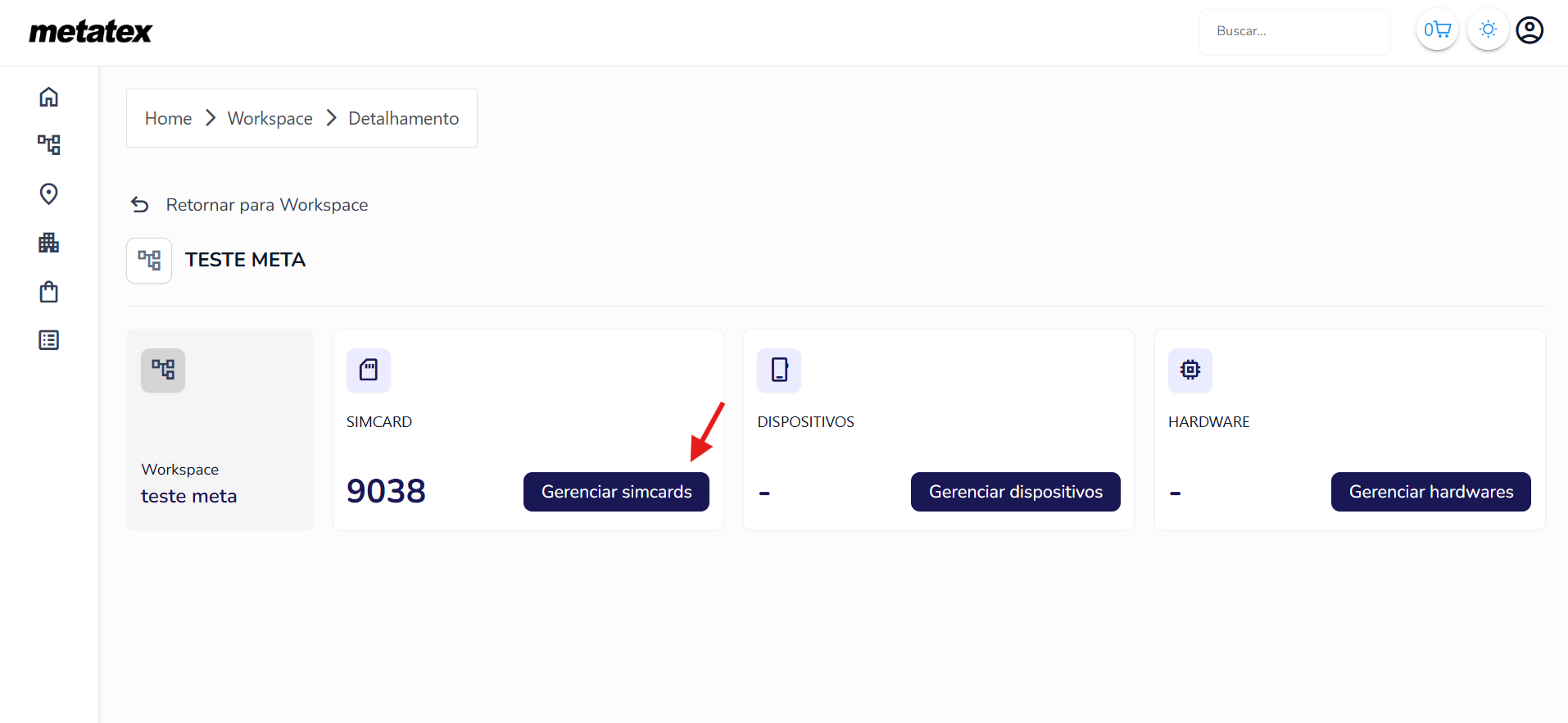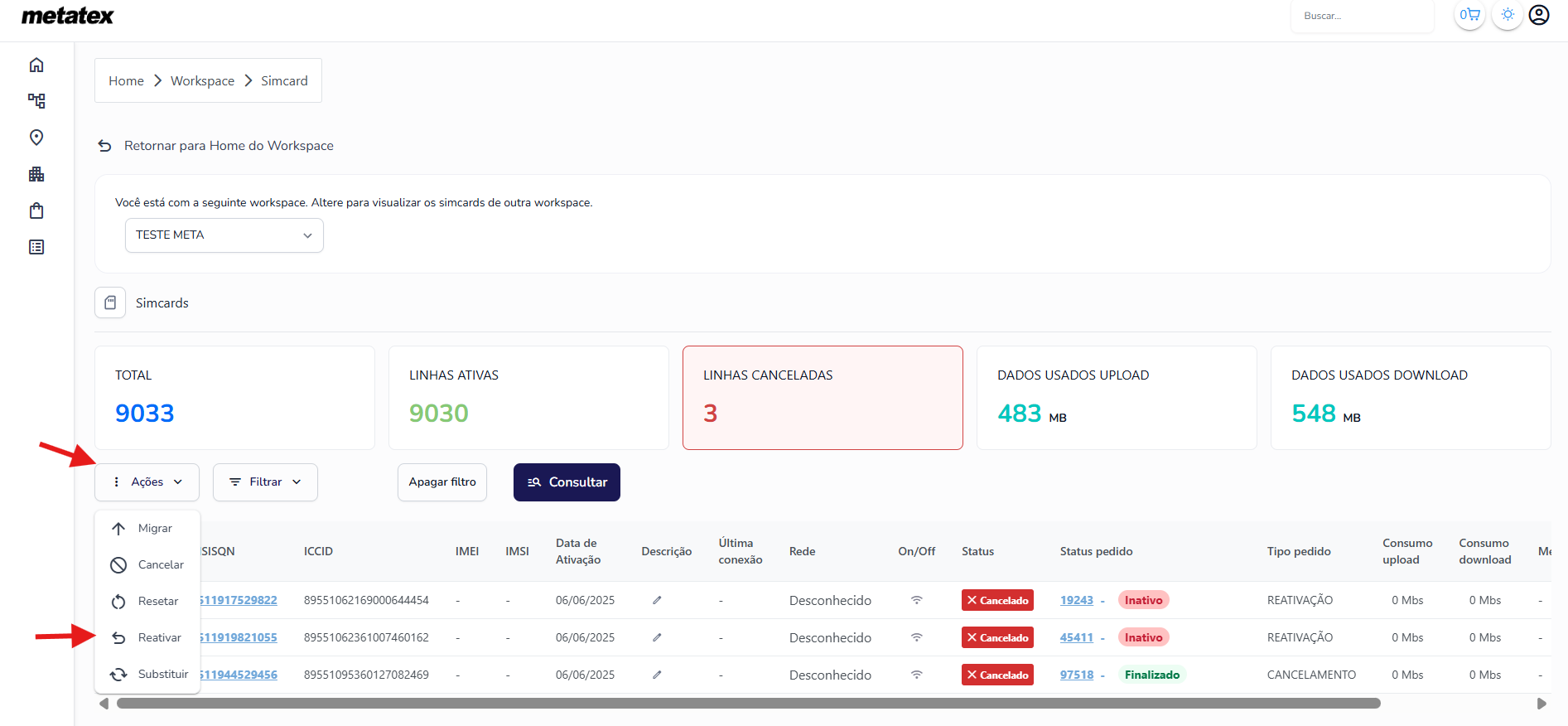 Opção 2: ir em "Workspace" e após "Gerenciar Simcards", podendo ser acompanhado na coluna "Status" e "Status do pedido".