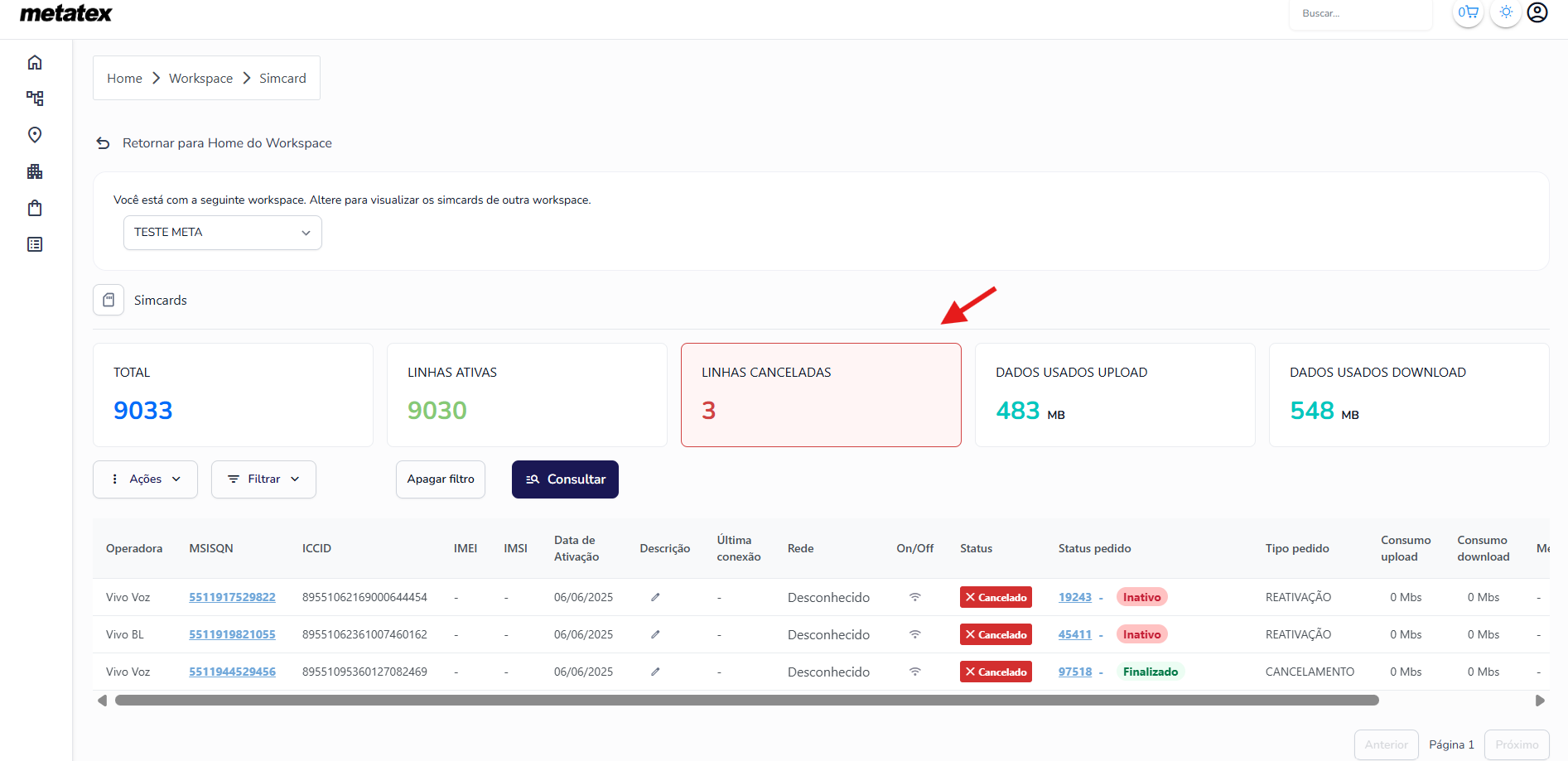 4. Verifique se está selecionado o filtro "Linhas Canceladas" (o ícone fica vermelho quando o filtro está ativo). Isso garante que todos os SIM Cards que foram cancelados sejam exibidos.