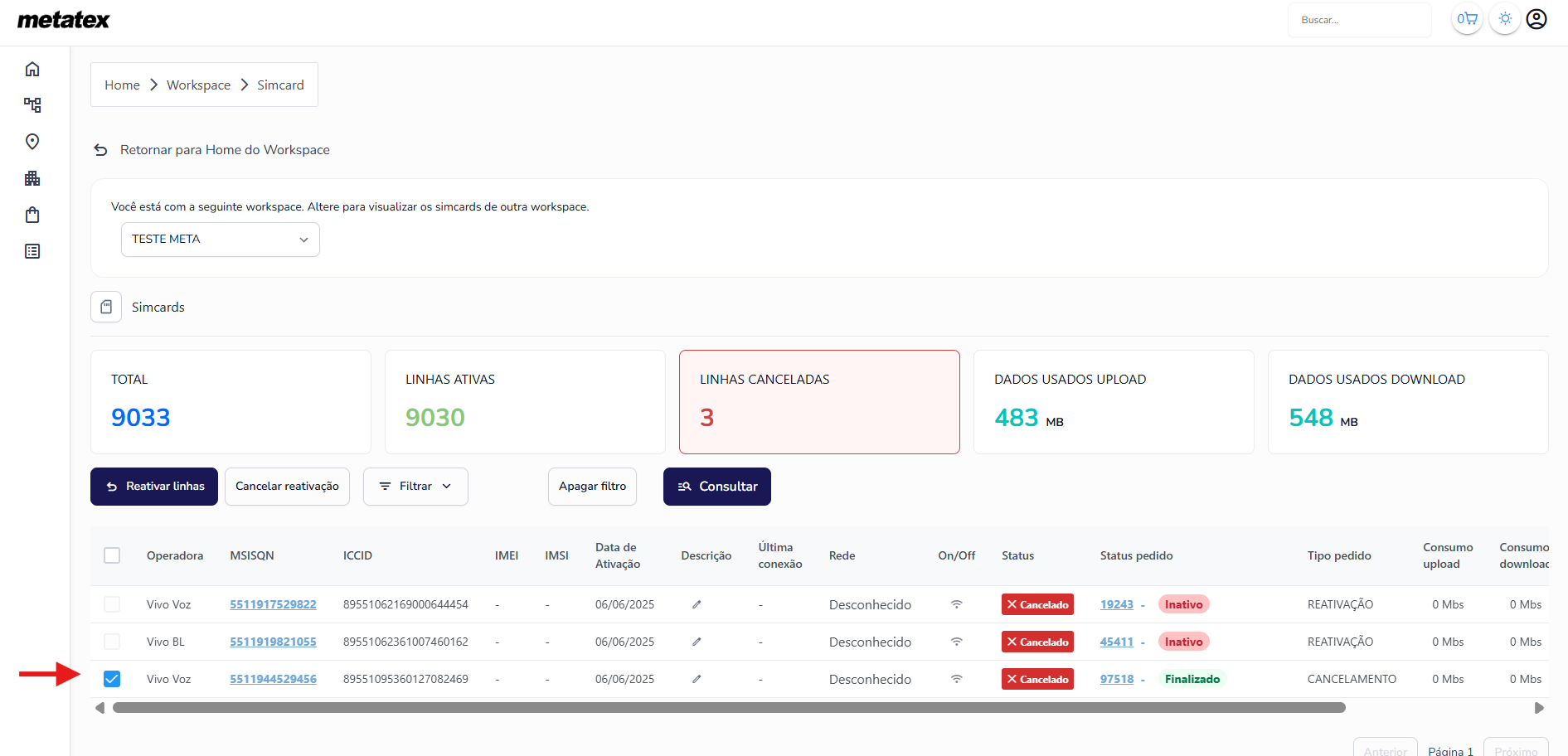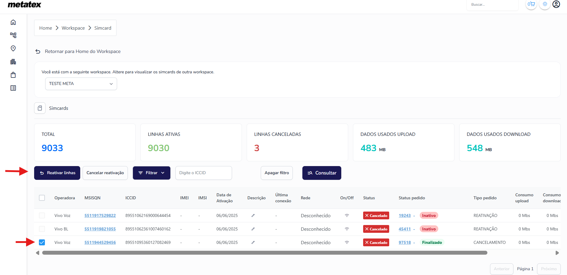 Opção 1: Selecione manualmente as linhas que deseja reativar. (Linhas que o status do pedido de cancelamento não estiver como "Finalizado" não podem ser selecionadas).