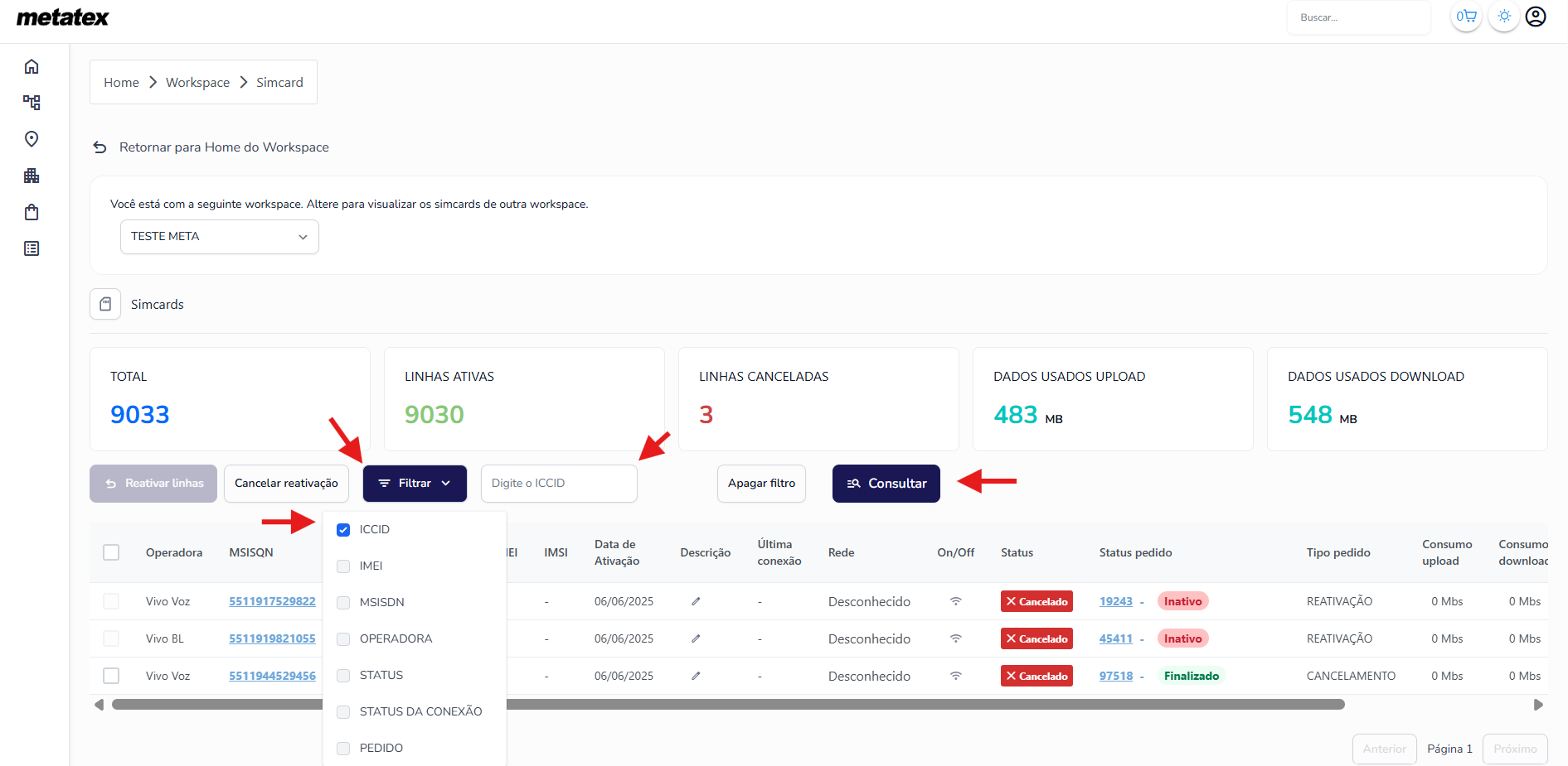 Opção 2: Use o filtro (ICCID, IMEI, MSISDN...) para localizar as linhas. Digite a numeração e clique em "Consultar".