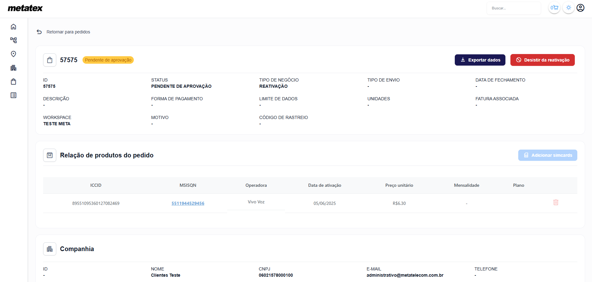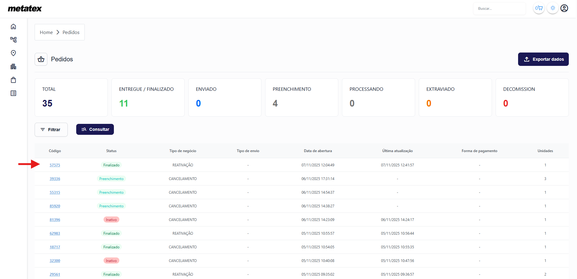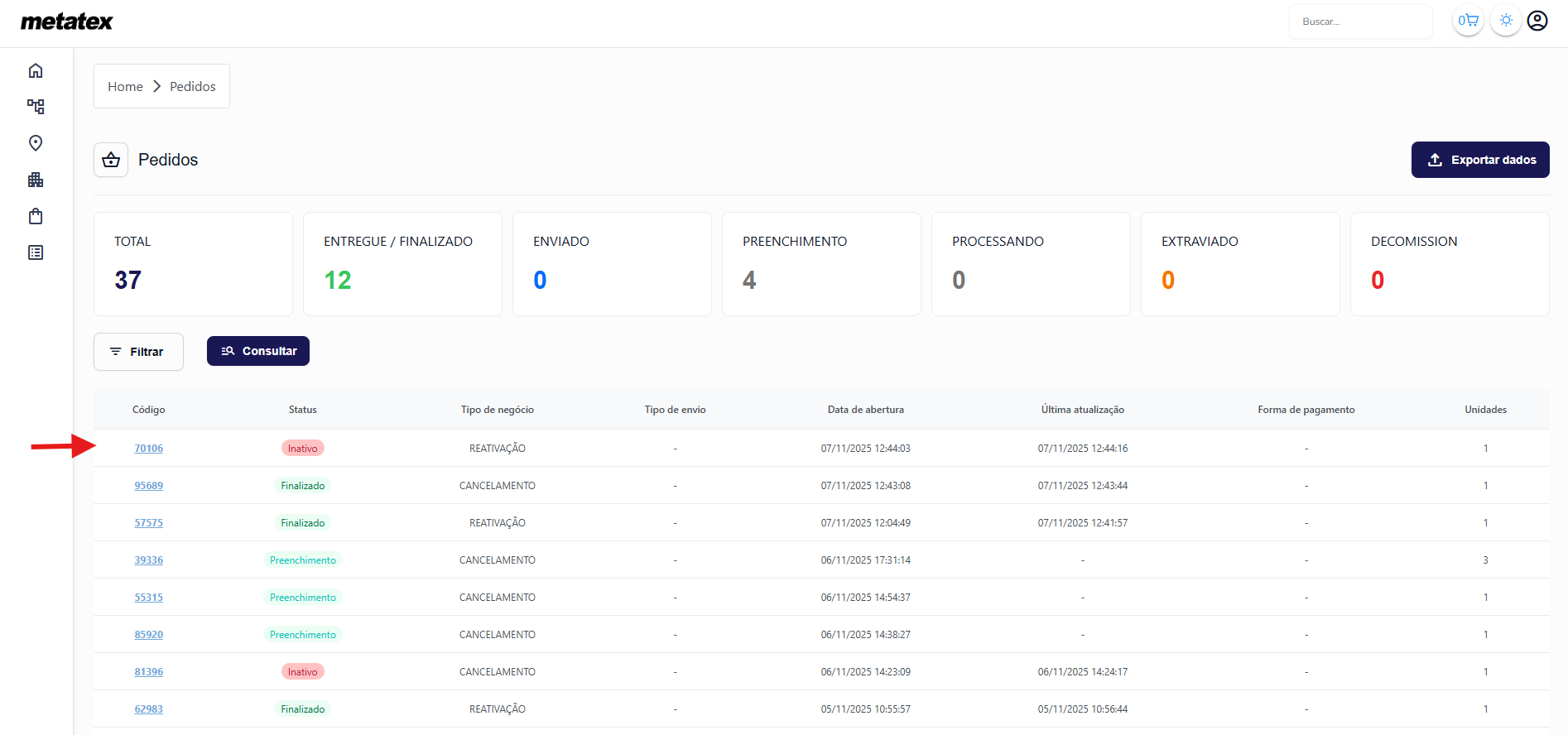 Pedidos de reativação concluídos com sucesso serão exibidos com o status “Finalizado”. Já os pedidos que não puderem ser realizados aparecerão com o status “Inativo”.
