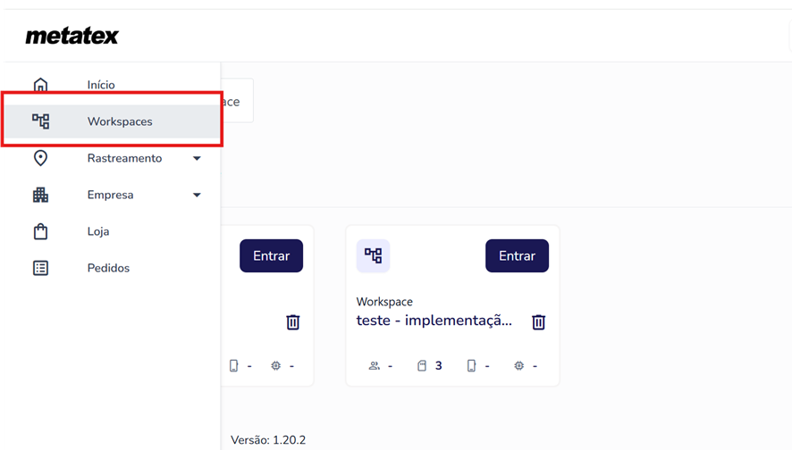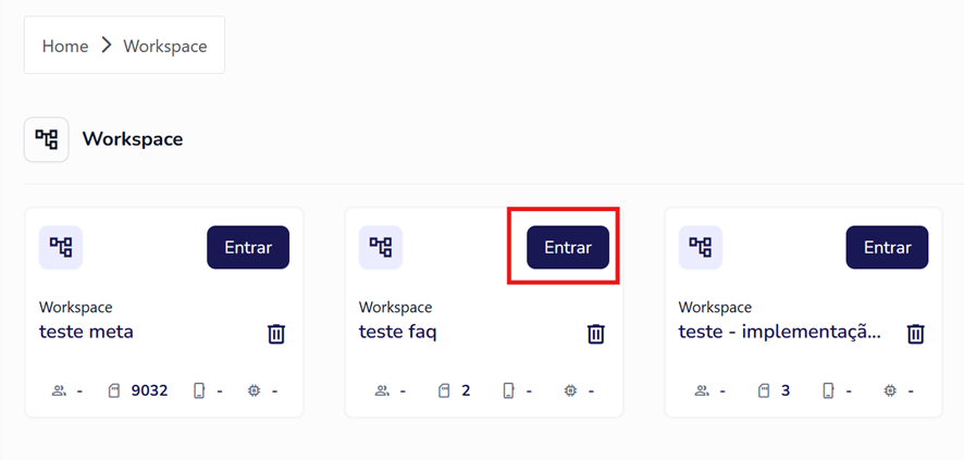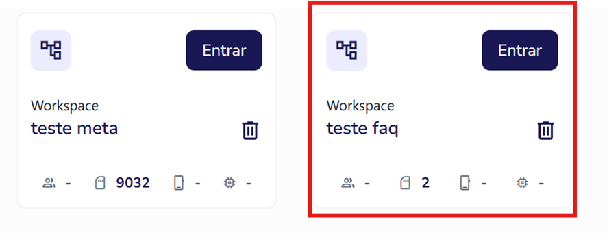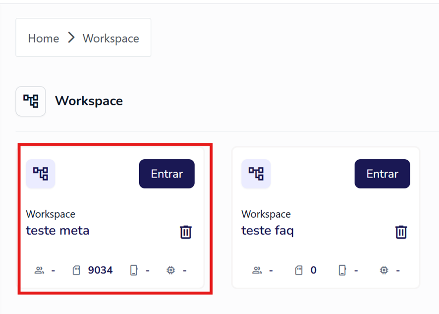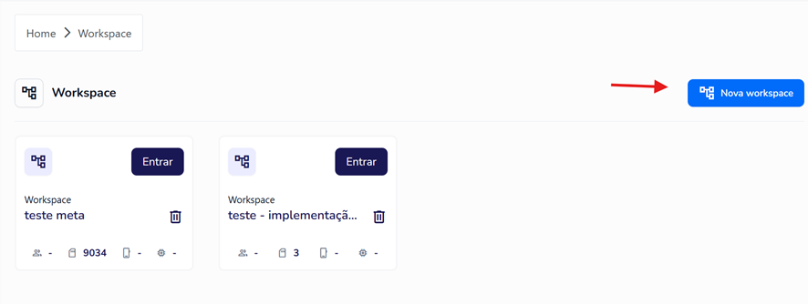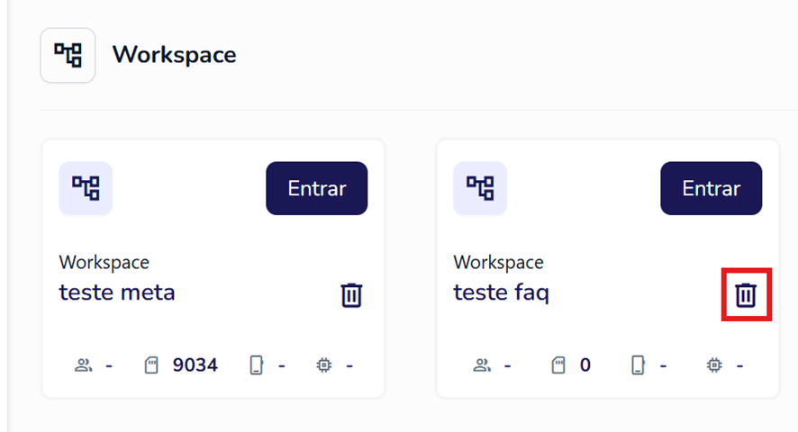 Após a migração, volte para a lista de Workspaces. Com o Workspace agora vazio, clique no ícone da lixeira para realizar a exclusão.