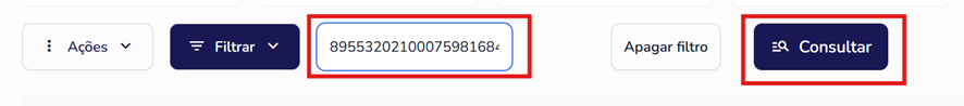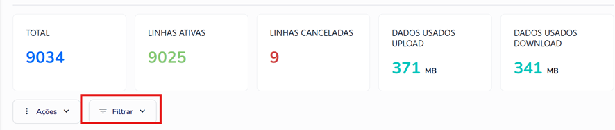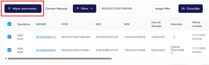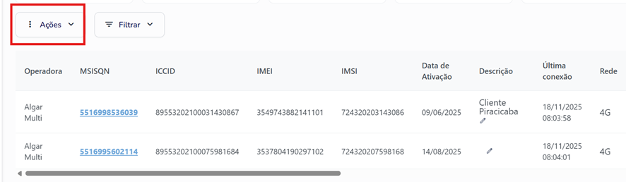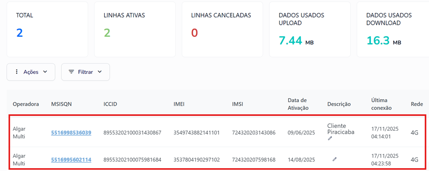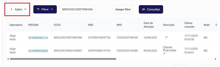 No exemplo, utilizaremos o ICCID para localizar as linhas.