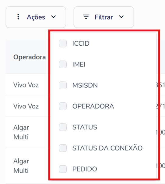 As opções de filtro disponíveis são: ICCID, IMEI, MSISDN, Operadora, Status, Status da Conexão e Pedido.