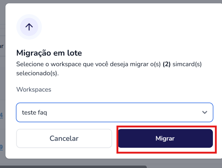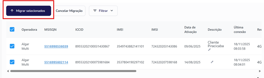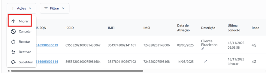 Selecione Gerenciar SIMCards para visualizar as linhas migradas