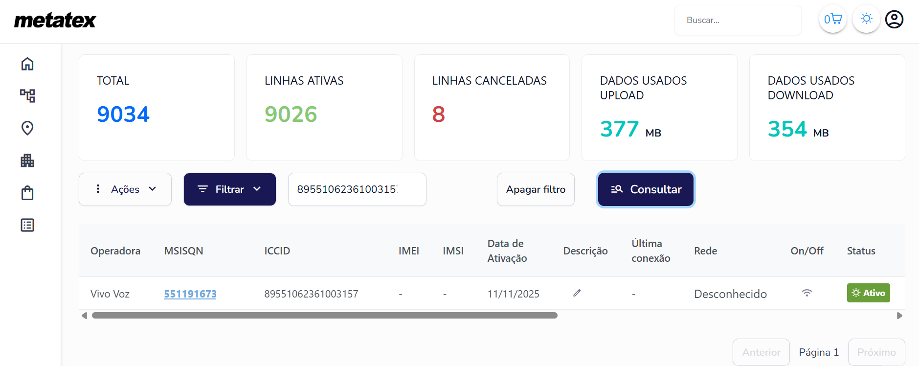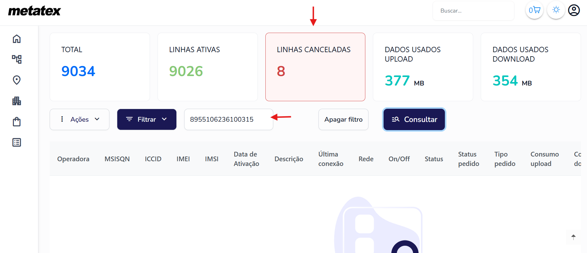 Exemplo: Caso eu filtre pelo ICCID de uma linha em específico que esteja ativa, mas o filtro do menu rápido de linhas canceladas esteja ativo, o sistema não irá conseguir trazer as informações devido a divergência na lógica de filtragem.