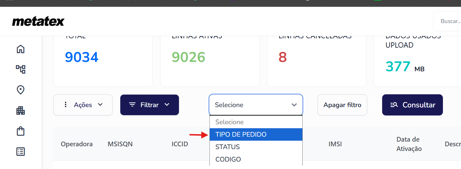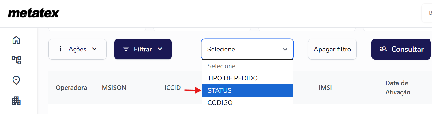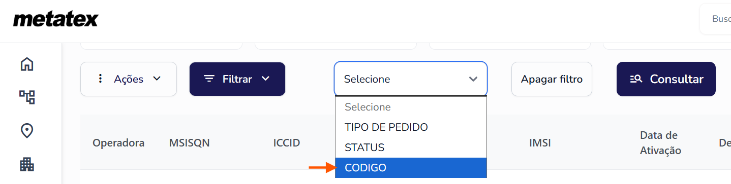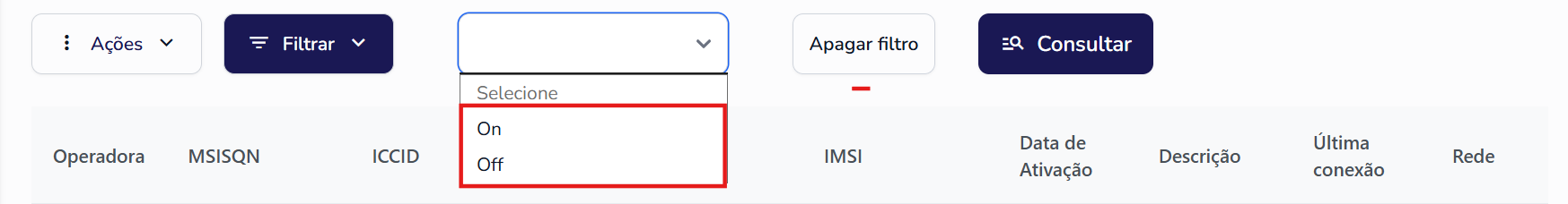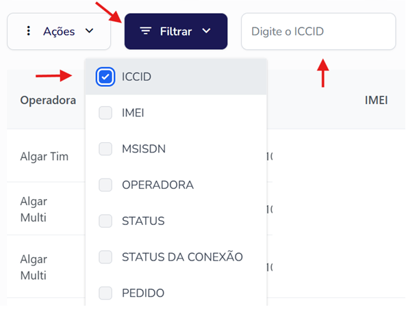 Para utilizar o filtro, acesse Filtrar > ICCID > Insira a numeração desejada.