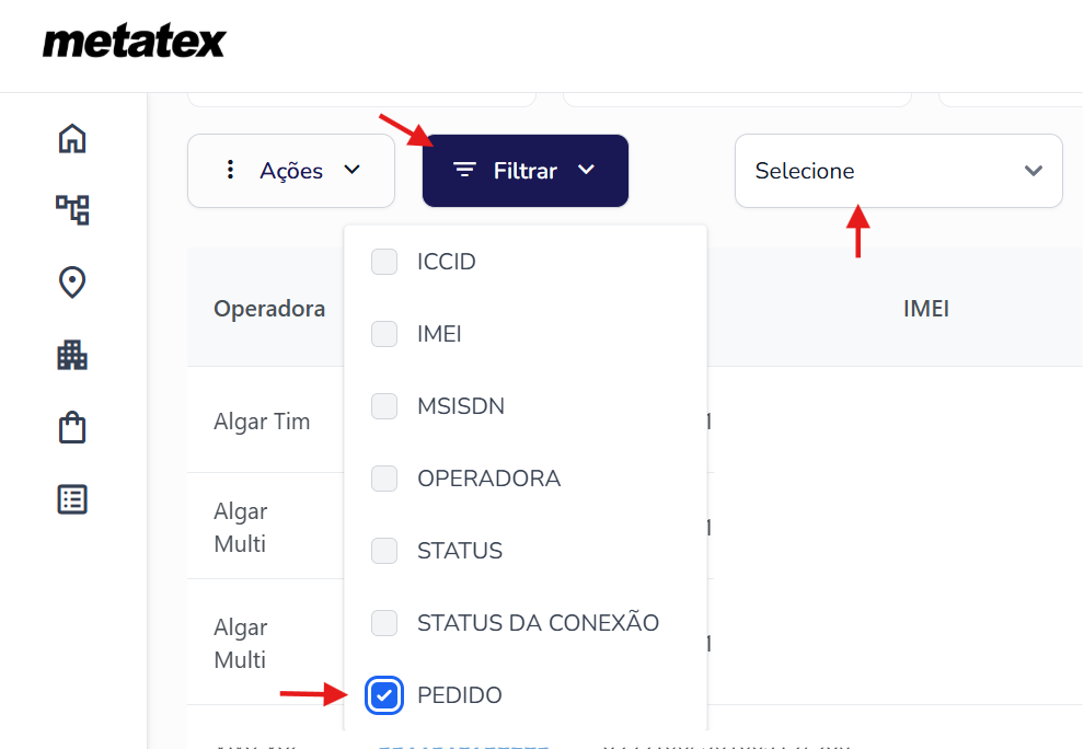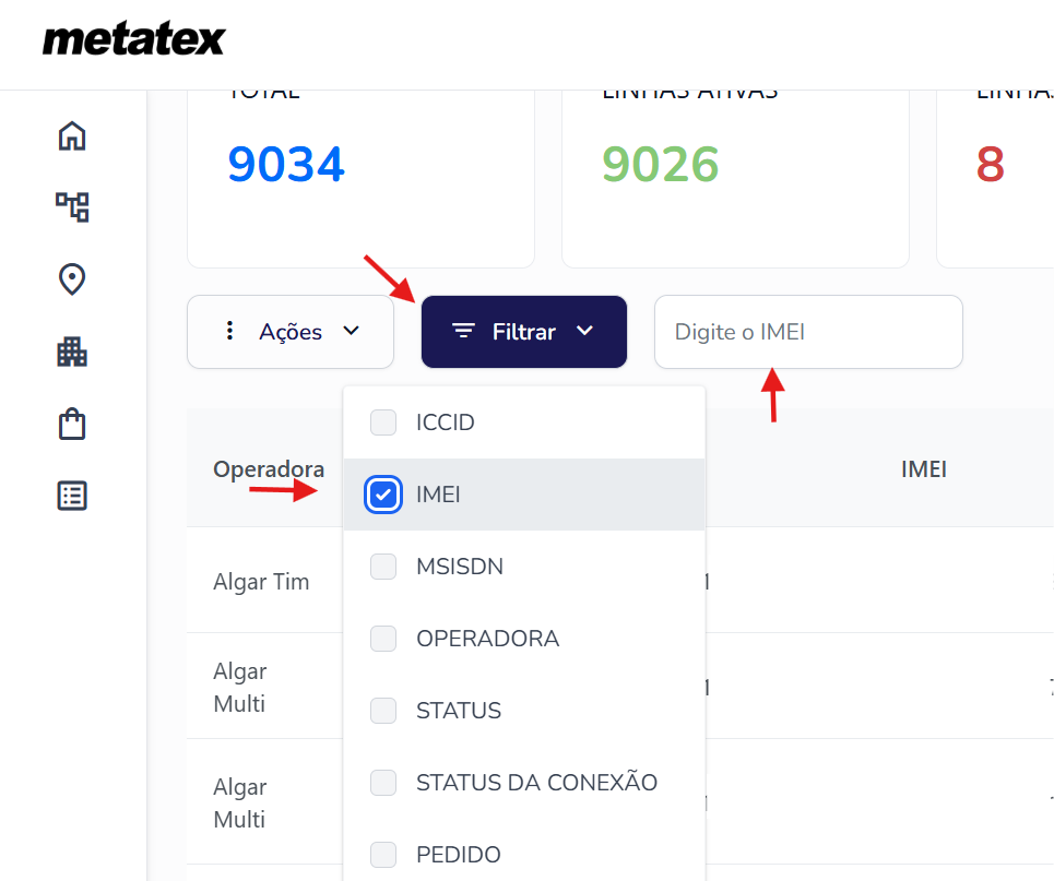 Para utilizar o filtro, acesse Filtrar > IMEI> Insira a numeração desejada.