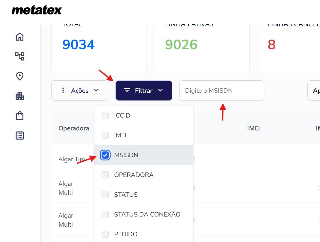 Para utilizar o filtro, acesse Filtrar > MSISDN> Insira a numeração desejada.