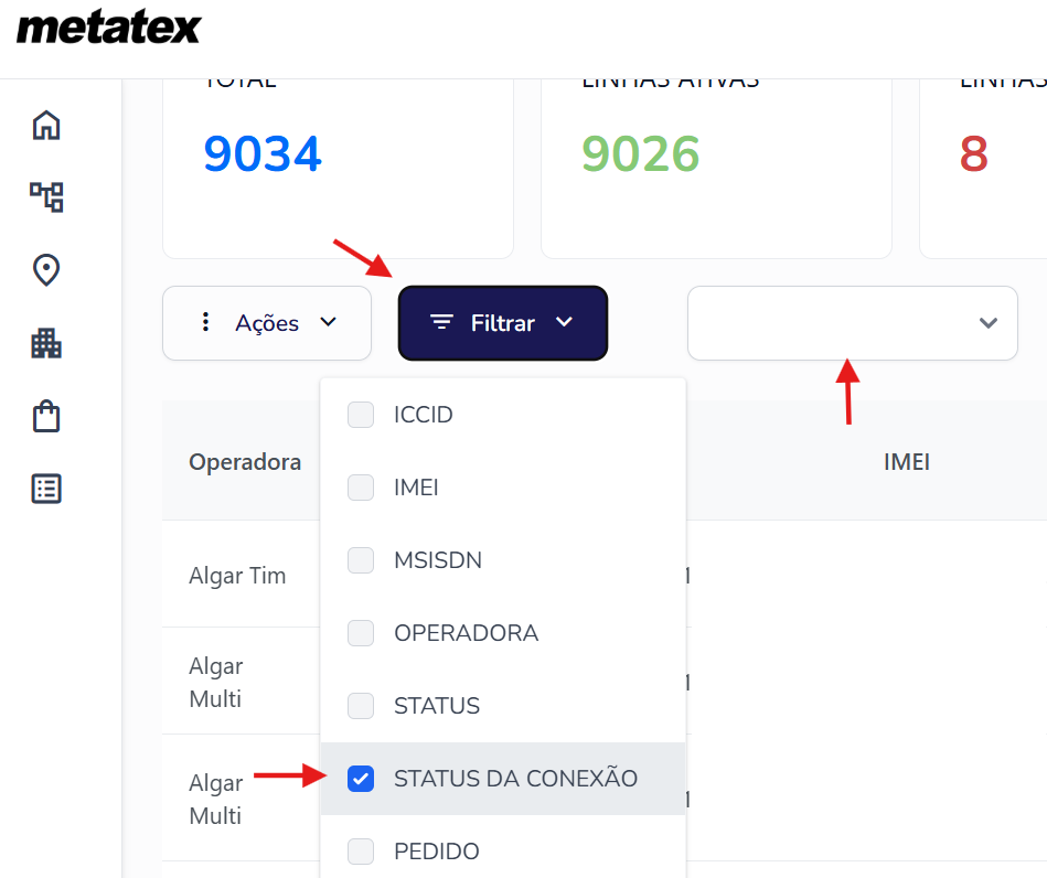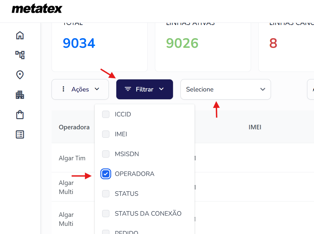 Para utilizar o filtro, acesse Filtrar > Operadora> Selecione a operadora desejada.