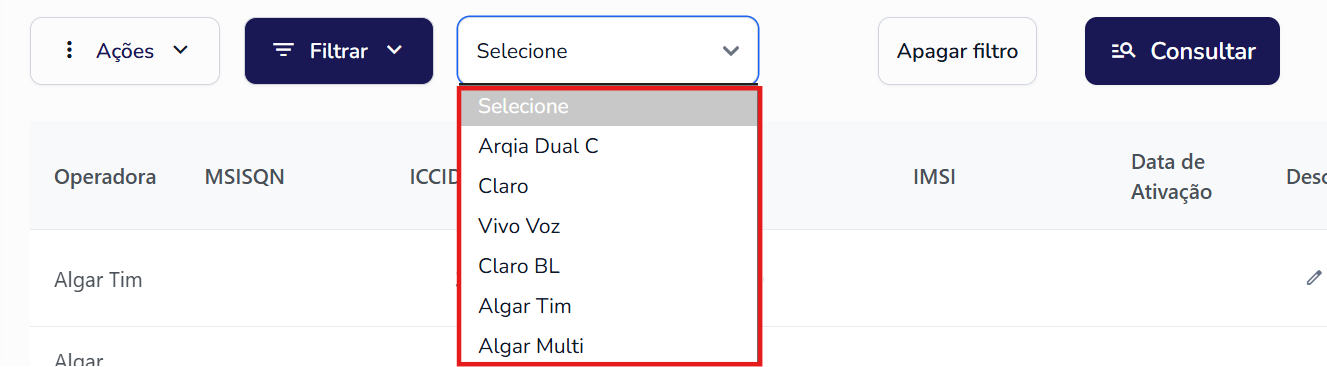 O filtro por operadora permite visualizar apenas as linhas daquela operadora dentro da workspace.