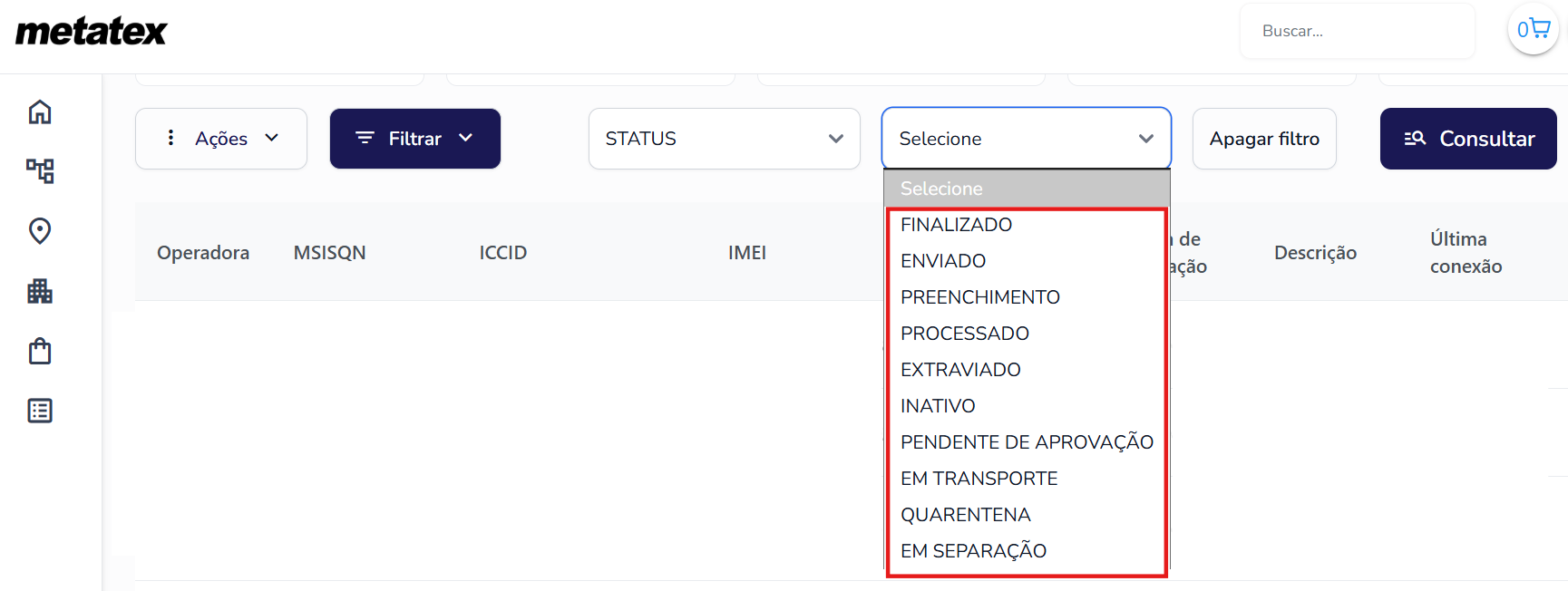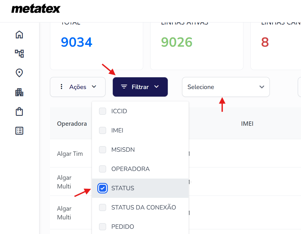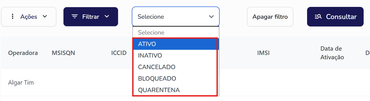 Permite realizar o filtro de acordo com o status administrativo da linha: