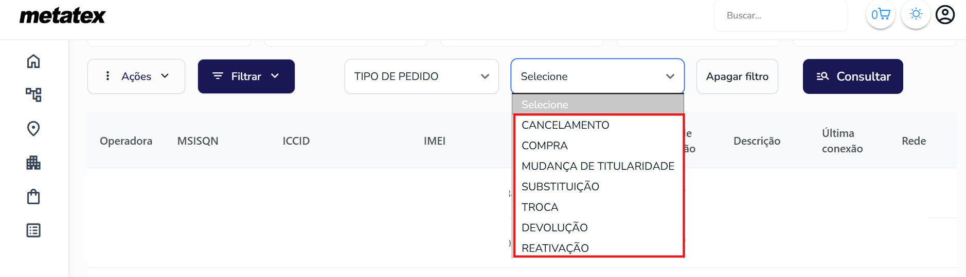 Para utilizar o filtro, acesse Filtrar > Pedido > Tipo de pedido > Selecione o tipo de pedido desejado.